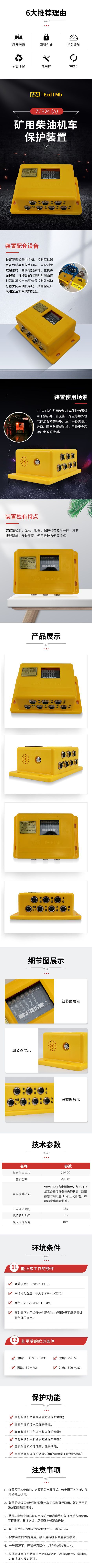 The ZCB24(A) Mining Diesel Locomotive Protection Device is designed for use in underground coal mine environments containing explosive gas mixtures, such as methane and coal dust. It is typically matched with various equipment using mining explosion-proof diesel engines or explosion-proof rubber-tired vehicles, and can also be used for monitoring safety and operational parameters.The device package consists of a main unit, a control driver, and various sensors and probes. When a monitored parameter exceeds its set limit, the sensor samples the data, the main unit triggers audible and visual alarms, and after a preset delay, the control driver outputs a signal to command an external actuator to shut off the fuel supply, stopping the diesel engine, thereby ensuring the safety of both the environment and the engine system.Integrating detection, display, alarm, protection, and power supply functions into one unit, the device features simple wiring, flexible installation, and ease of use and maintenance.Upon power-up, the main unit samples parameters such as temperature, coolant level, and oil pressure via the sensors and compares them with preset values. If any monitored value exceeds its limit, the device activates audible and visual alarms. After a defined delay, it outputs a control signal to drive the actuator, which closes the fuel line and stops the diesel engine. A manual shutdown button is also provided for direct engine stoppage. (An electrical block diagram of the device is typically included in full technical documentation.)