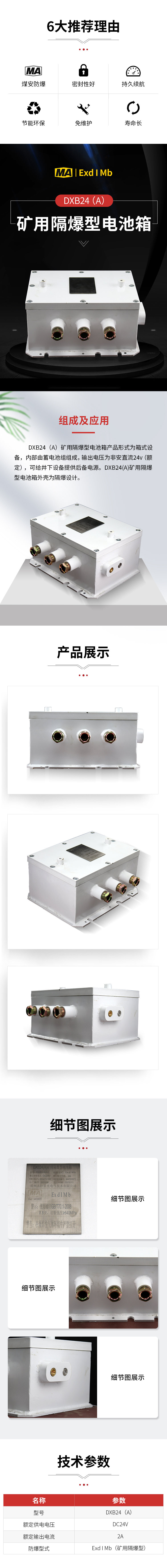 DXB24(A) Mining Flameproof Battery Box is designed as an enclosure-type unit. Internally, it consists of a battery pack and provides a rated DC 24V output, which can serve as a backup power supply for underground equipment. The housing of the DXB24(A) Battery Box is of flameproof construction.